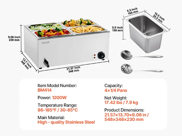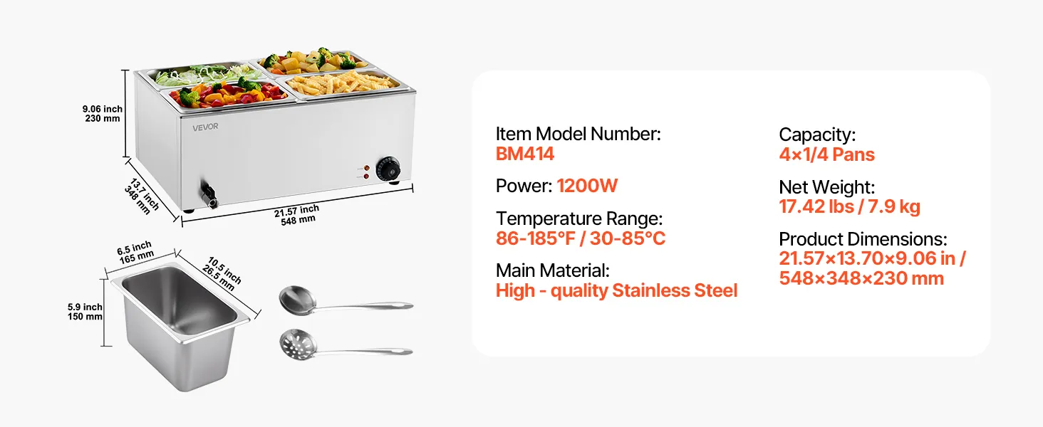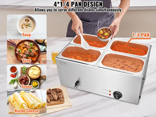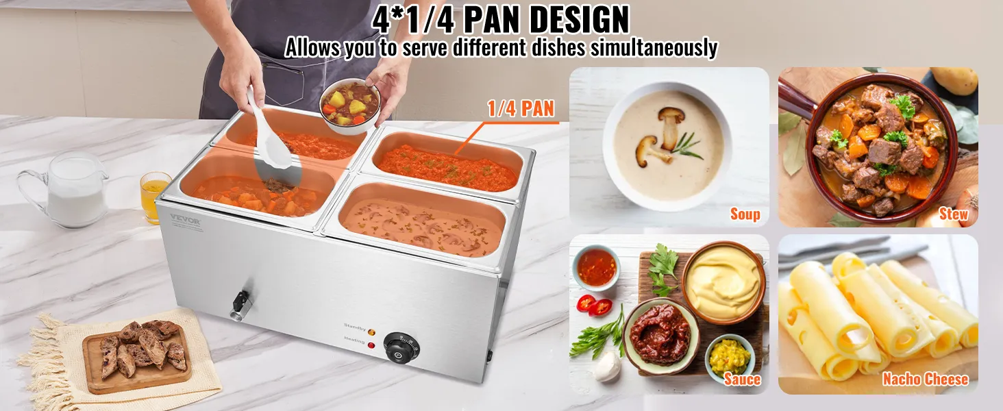 Flexible Combination: The buffet bain marie includes four 1/4-size pans with a standard 5.9-inch (15 cm) depth, compatible with all 5.9-inch deep compartments. Freely change your menu, from soups and sauces to stews and nacho cheese