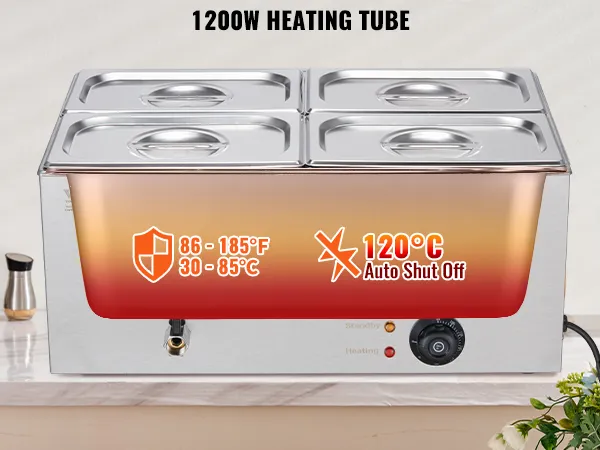 Fast Heating, Lasting Warmth: With a 1200W stainless steel heating tube, this commercial food warmer heats quickly to keep food at the perfect temperature and flavor. Adjustable temperature range: 86°F-185°F (30°C-85°C) to suit your preferences