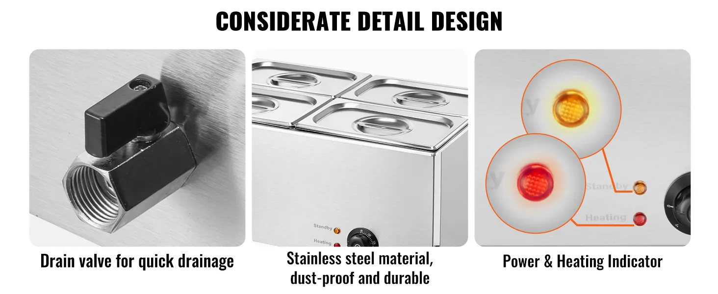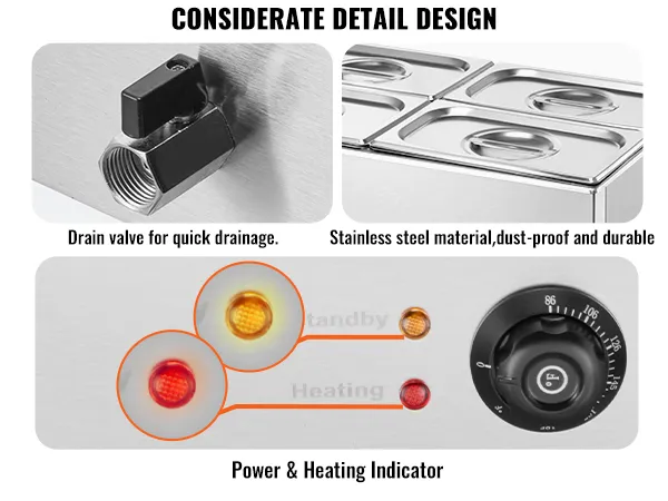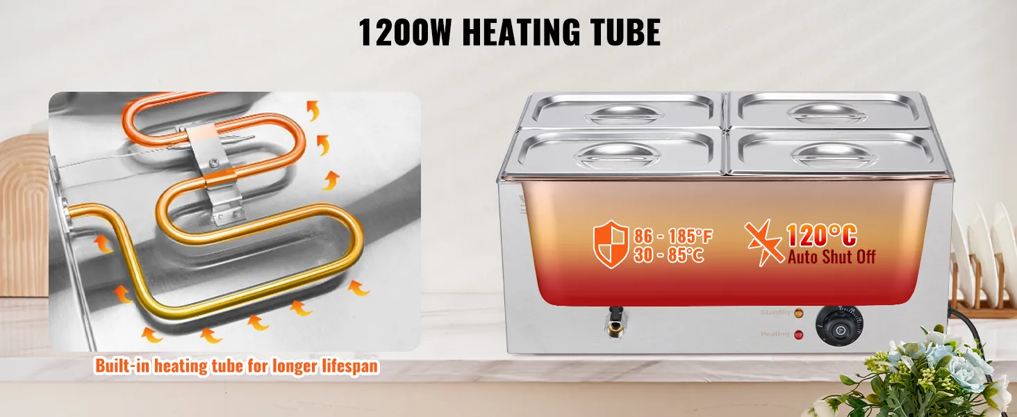 Equipped with a 1200W hidden heating tube, the buffet bain marie heats quickly and prevents scale buildup. Temperature adjustable from 86-185°F (30-85°C), with dual-color temperature indicators and auto shut-off when overheating. 3-step restart, but DO NOT add ice water to prevent damage.