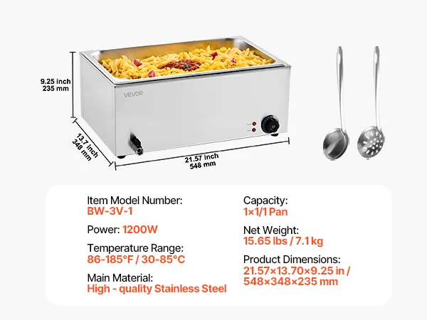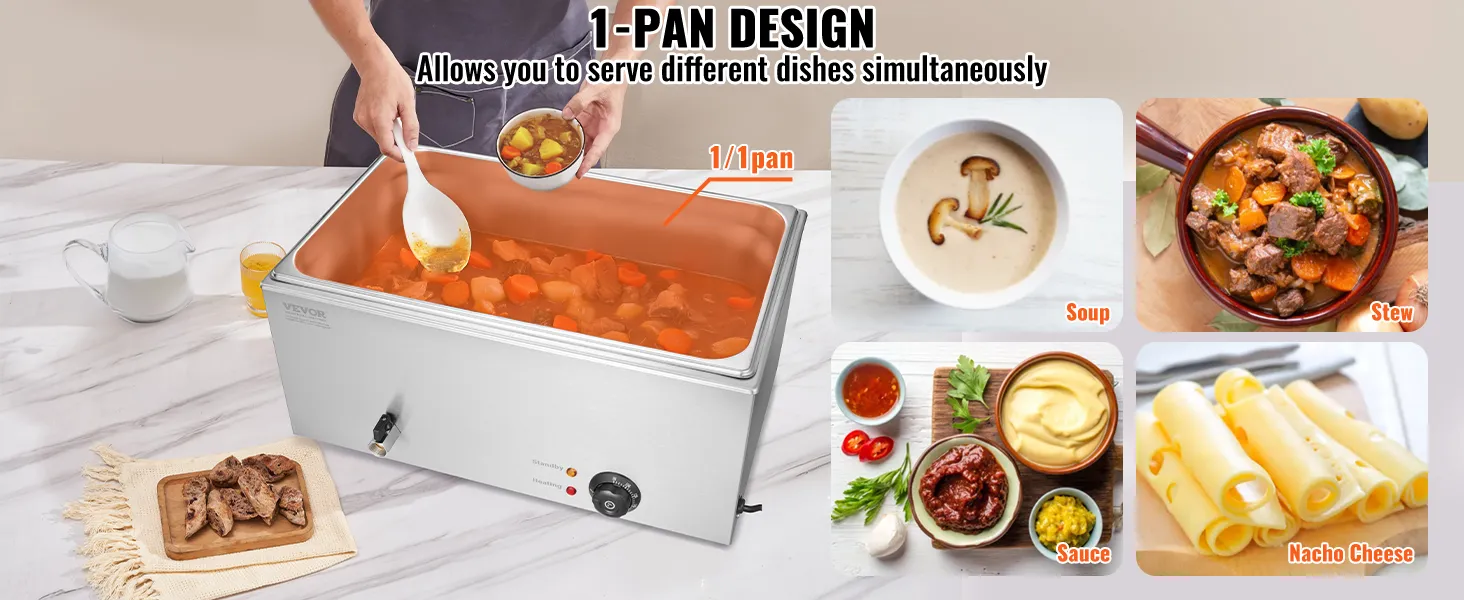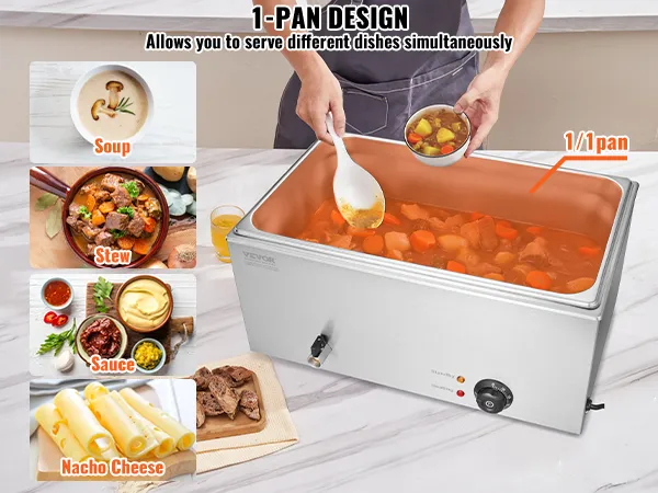 Este calentador de alimentos de acero inoxidable de 1 sartén cuenta con un diseño que evita quemaduras en seco y un sistema de reinicio para proteger contra daños. El rango de temperatura de 86 a 185 ℉ / 30 a 85 ℃ le permite seleccionar la configuración perfecta para su comida, manteniéndola caliente y lista para servir en cualquier momento.