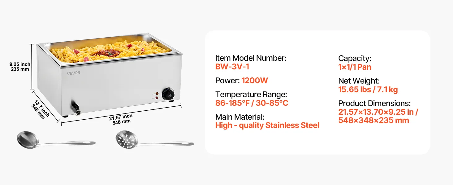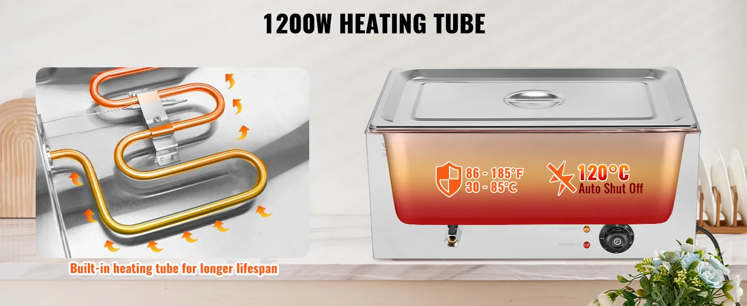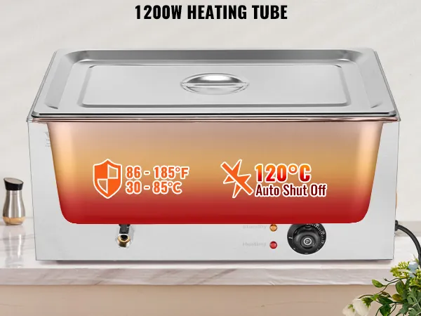Calentamiento rápido, calidez duradera: este impresionante calentador de alimentos con sartenes viene con un potente tubo de calentamiento de acero inoxidable de 1200 vatios que calienta rápidamente la comida para mantenerla caliente y con un delicioso sabor. Puede ajustar la temperatura de salida según sus preferencias, que van desde 86 a 185 ℉ / 30 a 85 ℃, gracias al controlador de temperatura.