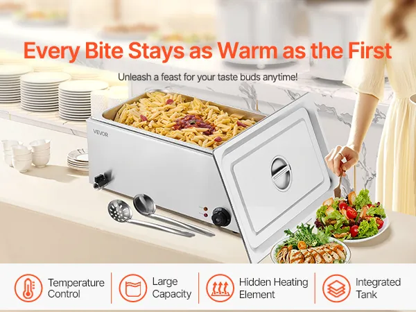 Nuestro calentador de alimentos eléctrico viene con una bandeja para alimentos de 19 qt/18 l acompañada de su respectiva tapa, lo que le permite calentar más alimentos a la vez. Mantenga sus deliciosos platos calientes de manera constante durante períodos prolongados, perfecto para cocinas comerciales con mucho movimiento.