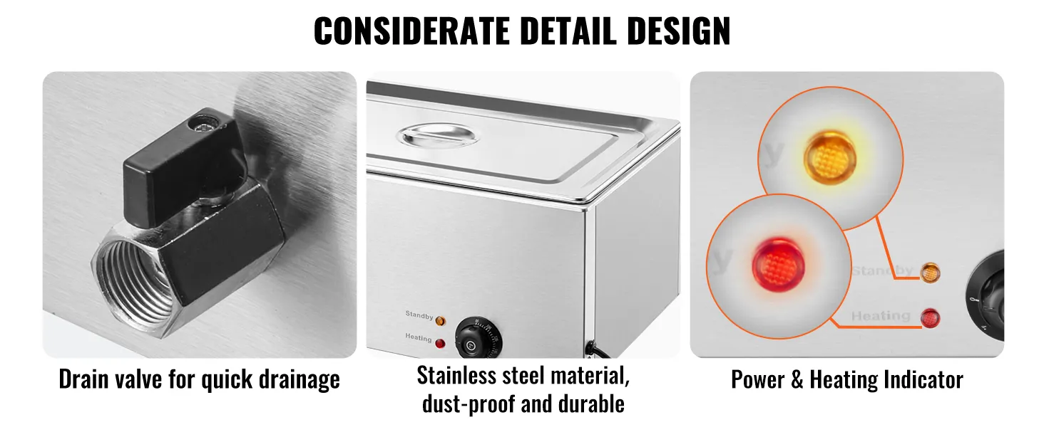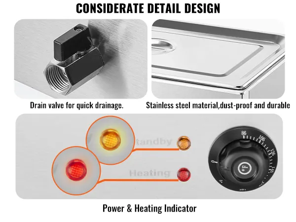Detalles hechos para ti: el recipiente está diseñado cuidadosamente con marcadores de nivel de agua en el interior para un fácil mantenimiento del agua. El recipiente cuenta con un grifo para drenar el agua después del uso, lo que reduce la molestia de limpiar el interior de la máquina. Además, se incluyen dos cucharones con mango extra largo, perfectos para ollas profundas.