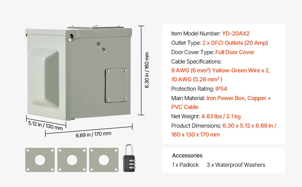 Caja de enchufes para exteriores VEVOR, dos tomacorrientes GFCI de 20 A, panel de enchufes con protección GFCI, resistente a la intemperie IP54, para decoraciones de Halloween e iluminación de patio.