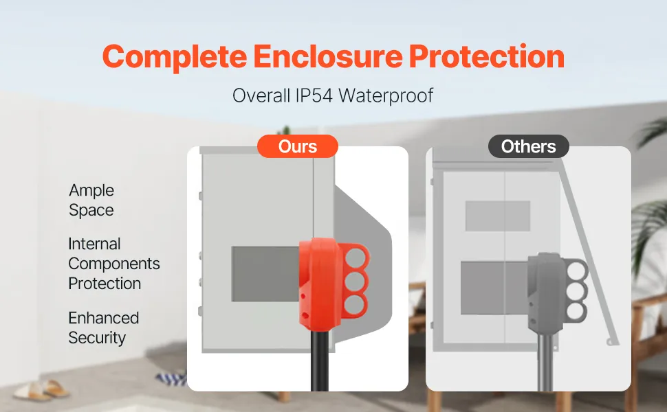 Impermeabilidad IP54, la seguridad es lo primero: ¡No dejes que la lluvia arruine tus planes! Nuestro panel de tomacorrientes para vehículos recreativos y eléctricos cuenta con una clasificación de impermeabilidad IP54 y tomacorrientes WR (resistentes a la intemperie) que se desconectan automáticamente cuando entran en contacto con el agua.