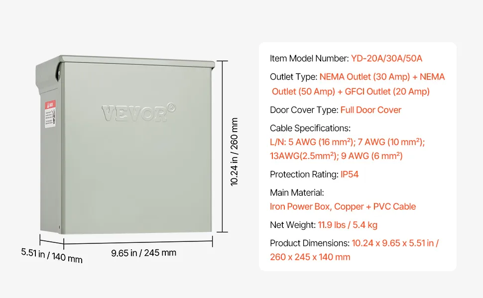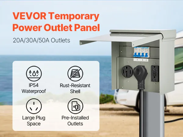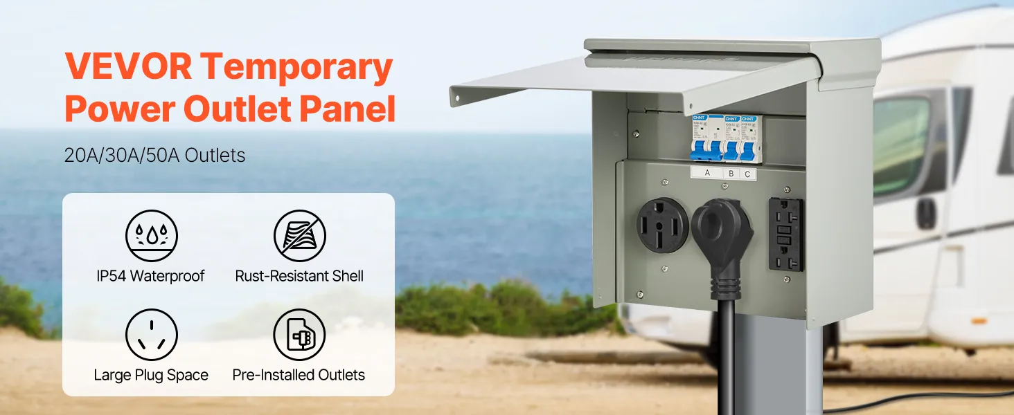 Panel de tomacorrientes temporal VEVOR de 20, 30 y 50 A para vehículos recreativos y vehículos eléctricos, con tomacorriente NEMA de 50 A, NEMA de 30 A, GFCI de 20 A instalado, caja impermeable IP54 precableada, para autocaravanas, caravanas y autocaravanas.