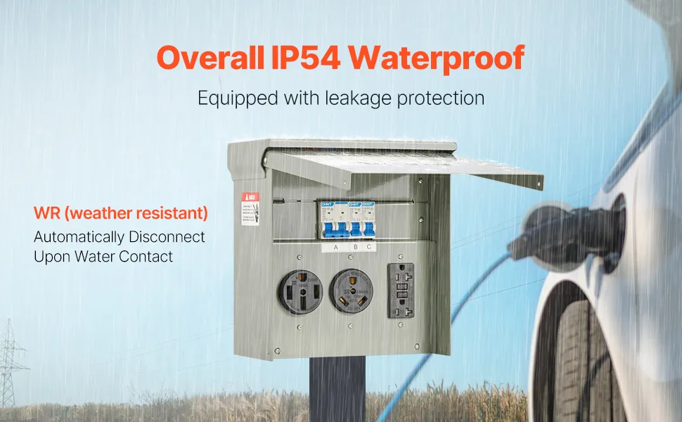 Impermeabilidad IP54, la seguridad es lo primero: ¡No dejes que la lluvia arruine tus planes! Nuestro panel de tomacorrientes para vehículos recreativos y eléctricos cuenta con una clasificación de impermeabilidad IP54 y tomacorrientes WR (resistentes a la intemperie) que se desconectan automáticamente cuando entran en contacto con el agua.