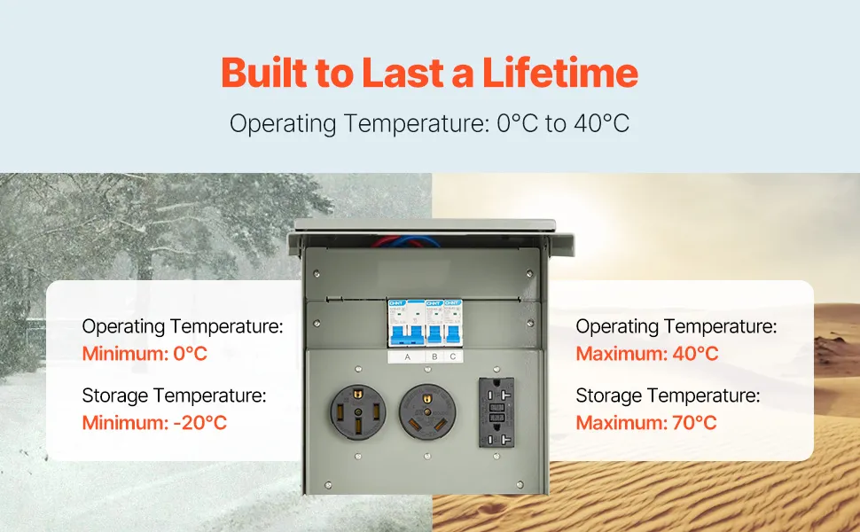 Durabilidad y confiabilidad en las que puede confiar: Fabricada con una carcasa resistente que soporta condiciones climáticas adversas, nuestra caja de tomacorrientes resiste el óxido y el deterioro. Temperatura de funcionamiento: de 0 ℃ a 40 ℃ y temperatura de almacenamiento: de -20 ℃ a 70 ℃. Evita el envejecimiento y garantiza años de rendimiento confiable.