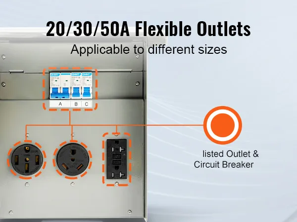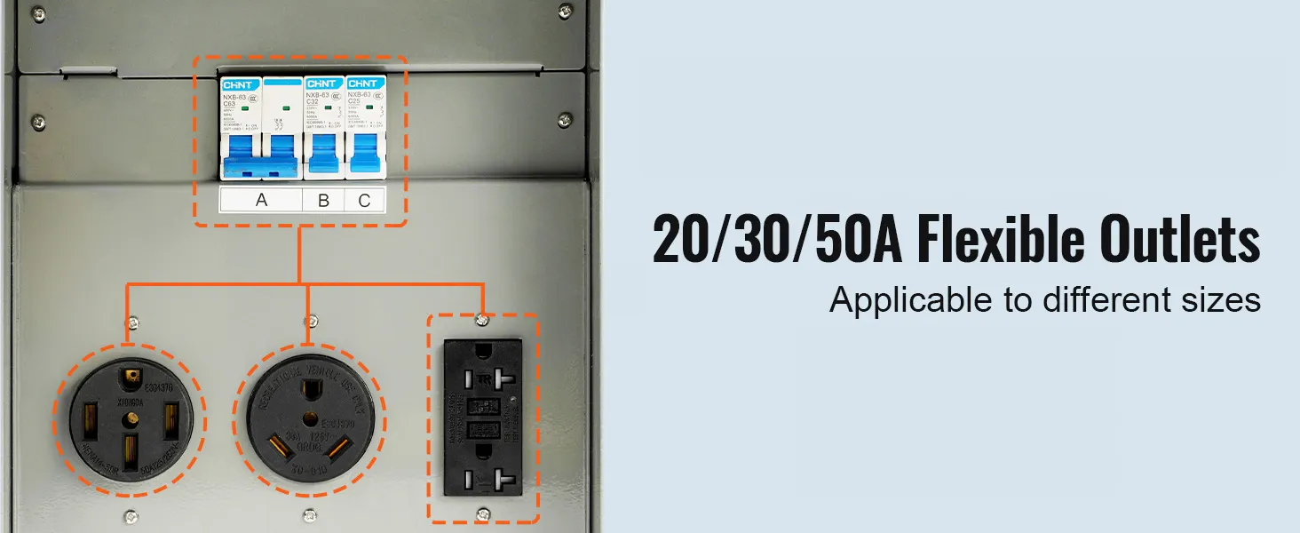 Este panel de toma de corriente temporal ofrece opciones de personalización para ajustar las necesidades específicas del proyecto y las preferencias del usuario. Sus receptáculos de 20/30/50 amperios permiten optimizar la distribución de energía, la gestión de cables y la protección de circuitos.
