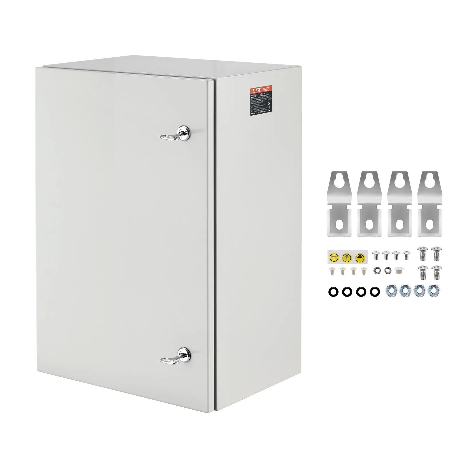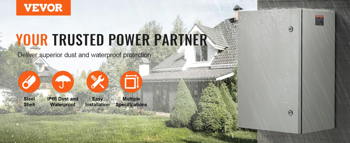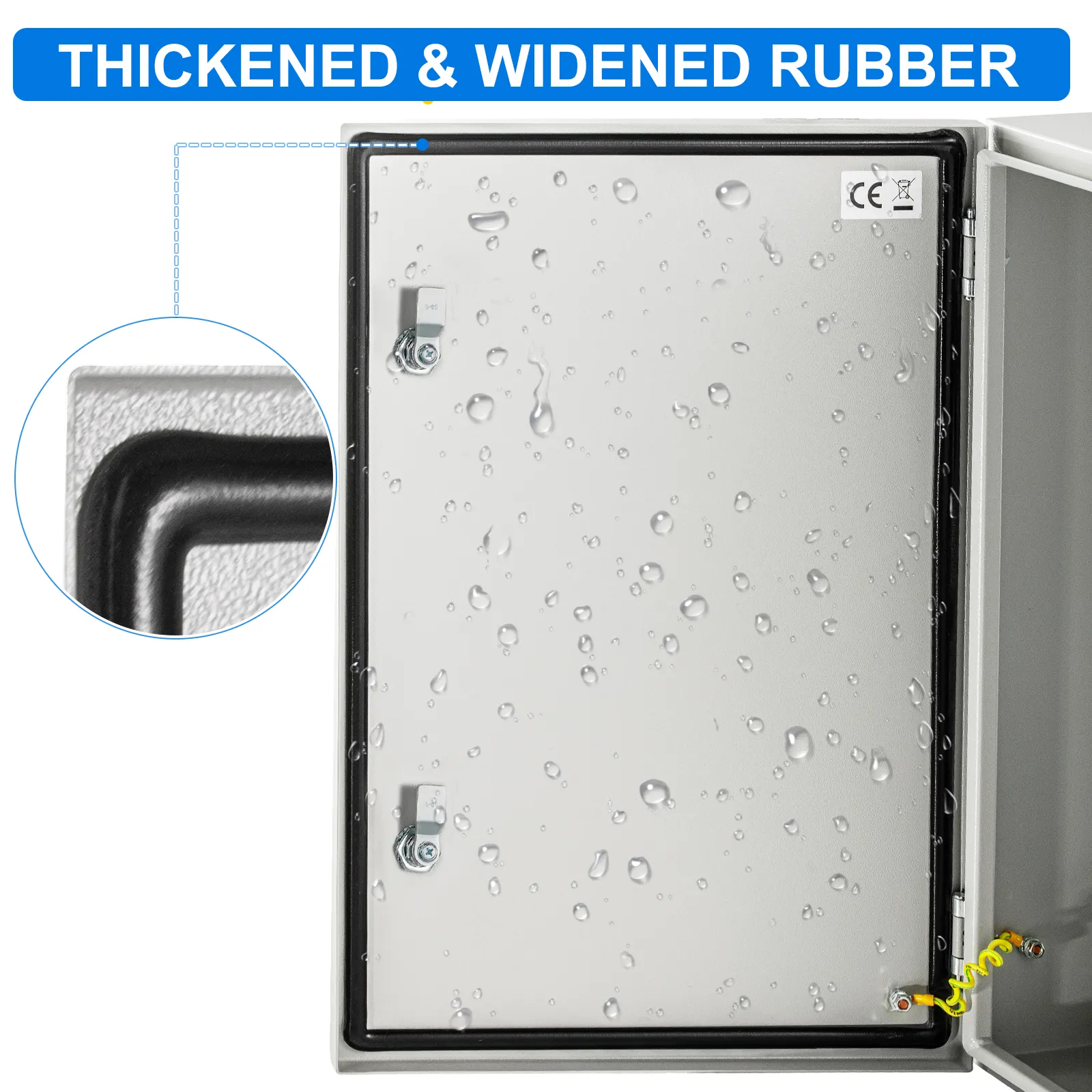 - La caja del armario eléctrico está fabricada en acero al carbono de alta calidad. El diseño de bloqueo preciso, las bisagras de alta resistencia, las tiras de sellado y el grado de protección IP66 se utilizan para proteger sus enchufes, cables de alimentación y otros equipos de la influencia del clima. Por lo tanto, para asegurar el circuito protegido de líquidos y corrosión.