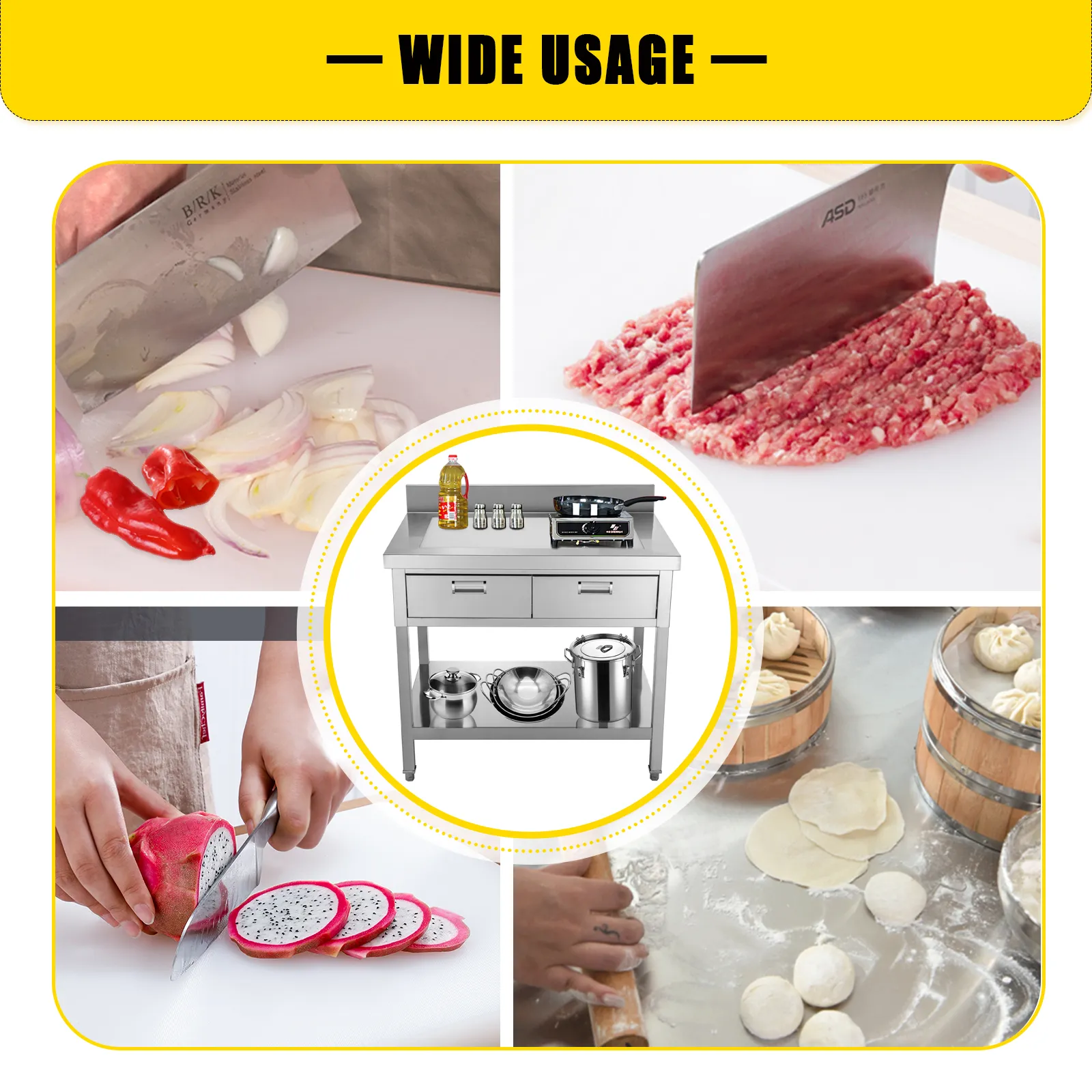 Esta mesa de cocina de acero inoxidable es robusta para proporcionar una capacidad de carga de 992 libras sin temblar; Adopta dos estantes con gran espacio, lo que permite un almacenamiento masivo y un área de trabajo.