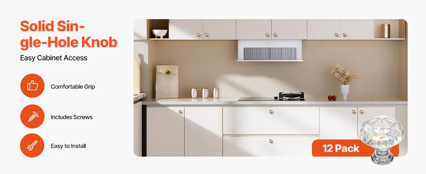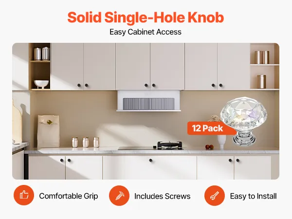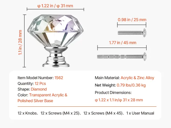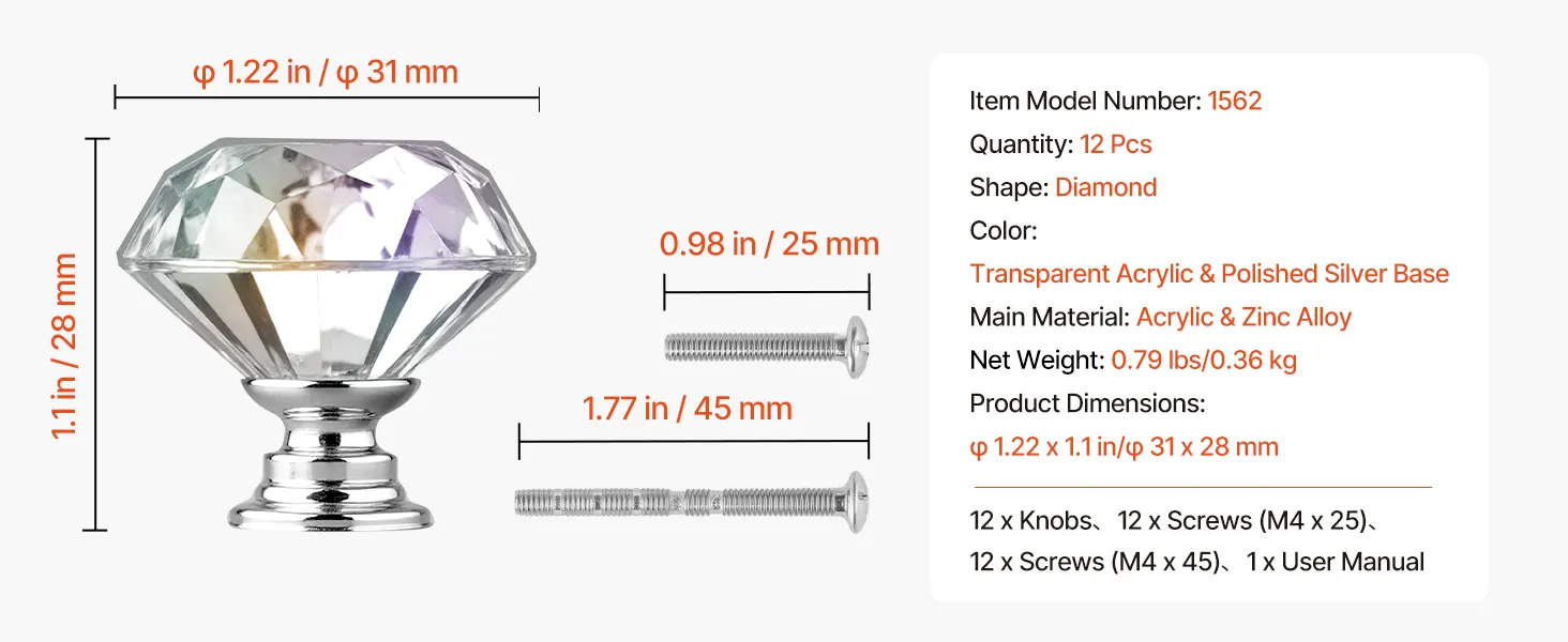 VEVOR - Pomos para armario (12 unidades, 1,22 pulgadas, acrílico y aleación de zinc), tiradores para cajones, manijas para puertas, pomos sólidos de diamante para cocina, manijas para tocador, herrajes con tornillos para armarios de baño y cajones.