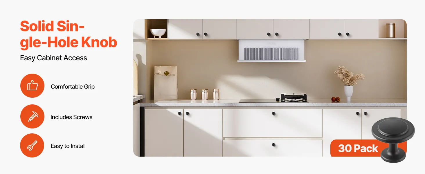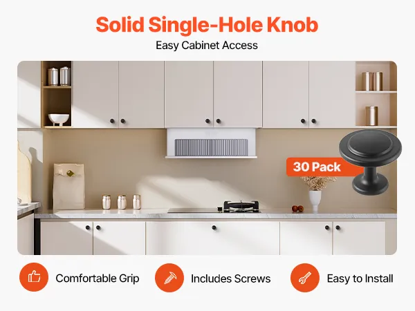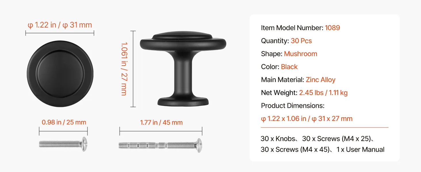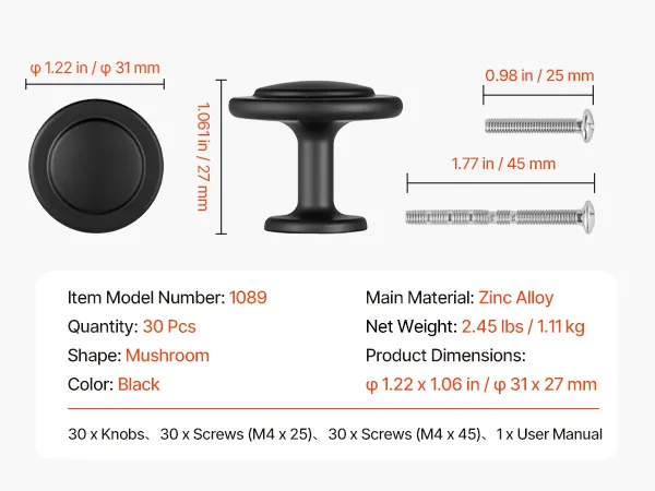 VEVOR - Pomos para armario (30 unidades, 1,22 pulgadas, aleación de zinc negro, para cajones y puertas), diseño de hongo, herrajes para armarios de cocina, armarios y cajones, con tornillos