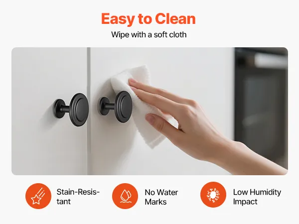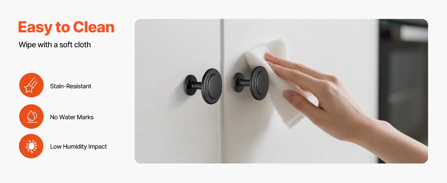 Mantenimiento mínimo: Para la limpieza diaria, simplemente limpie el pomo del cajón con un paño suave, seco o húmedo. Su superficie densa y lisa resiste las manchas de agua y la grasa, recuperando su aspecto limpio y brillante en segundos y manteniéndolo impecable a largo plazo.