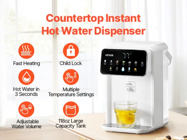 Dispensador de agua caliente instantánea VEVOR, dispensador de agua hirviendo de sobremesa con 7 temperaturas y 7 volúmenes de agua ajustables, depósito de agua extraíble de 3,5 litros (118 oz), calentamiento rápido con pantalla táctil y bloqueo infantil para el hogar