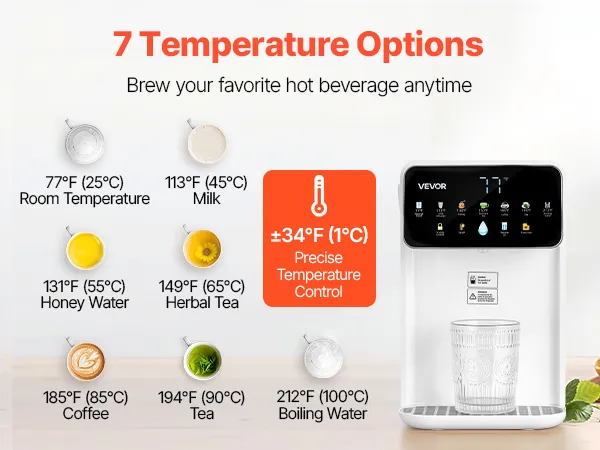 Este dispensador de agua caliente instantánea ofrece 7 opciones de temperatura preestablecidas (77 °F, 113 °F, 131 °F, 149 °F, 185 °F, 194 °F, 212 °F), con un control de temperatura preciso de ±34 °F, lo que garantiza temperaturas ideales para preparar diversas bebidas calientes.