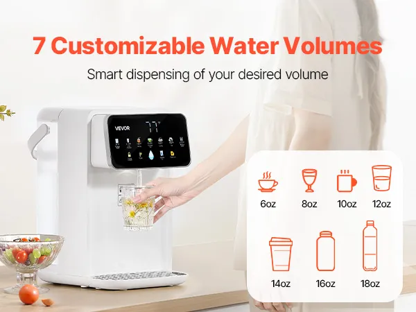 7 temperaturas y 7 volúmenes de agua: Este dispensador de agua de encimera ofrece un control preciso de la temperatura con 7 temperaturas preestablecidas (77 °F, 113 °F, 131 °F, 149 °F, 185 °F, 194 °F, 212 °F) y 7 volúmenes de agua (6 oz, 8 oz, 10 oz, 12 oz, 14 oz, 16 oz, 18 oz)