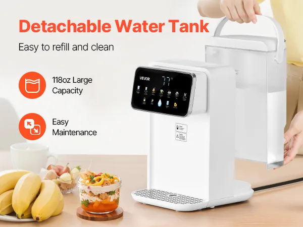 Equipado con un tanque de agua extraíble de 118 oz, este dispensador de agua caliente eléctrico es fácil de rellenar y limpiar, ofreciendo comodidad y practicidad para el uso diario.