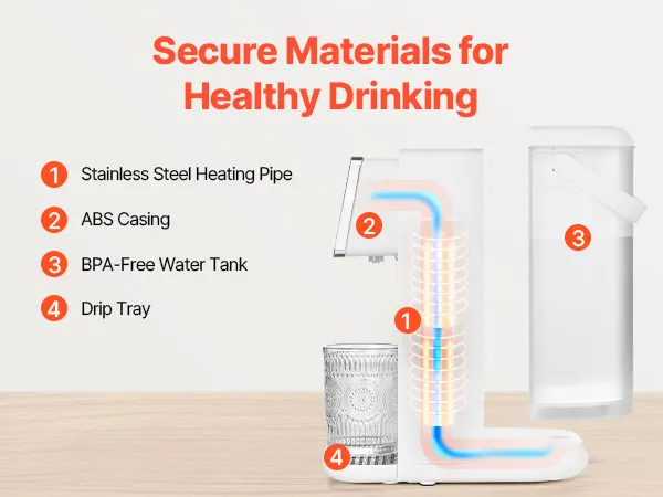 El sistema de calentamiento está hecho de acero inoxidable apto para uso alimentario, mientras que el tanque de agua está elaborado con material ASB libre de BPA, lo que garantiza agua potable limpia y segura para usted y su familia.