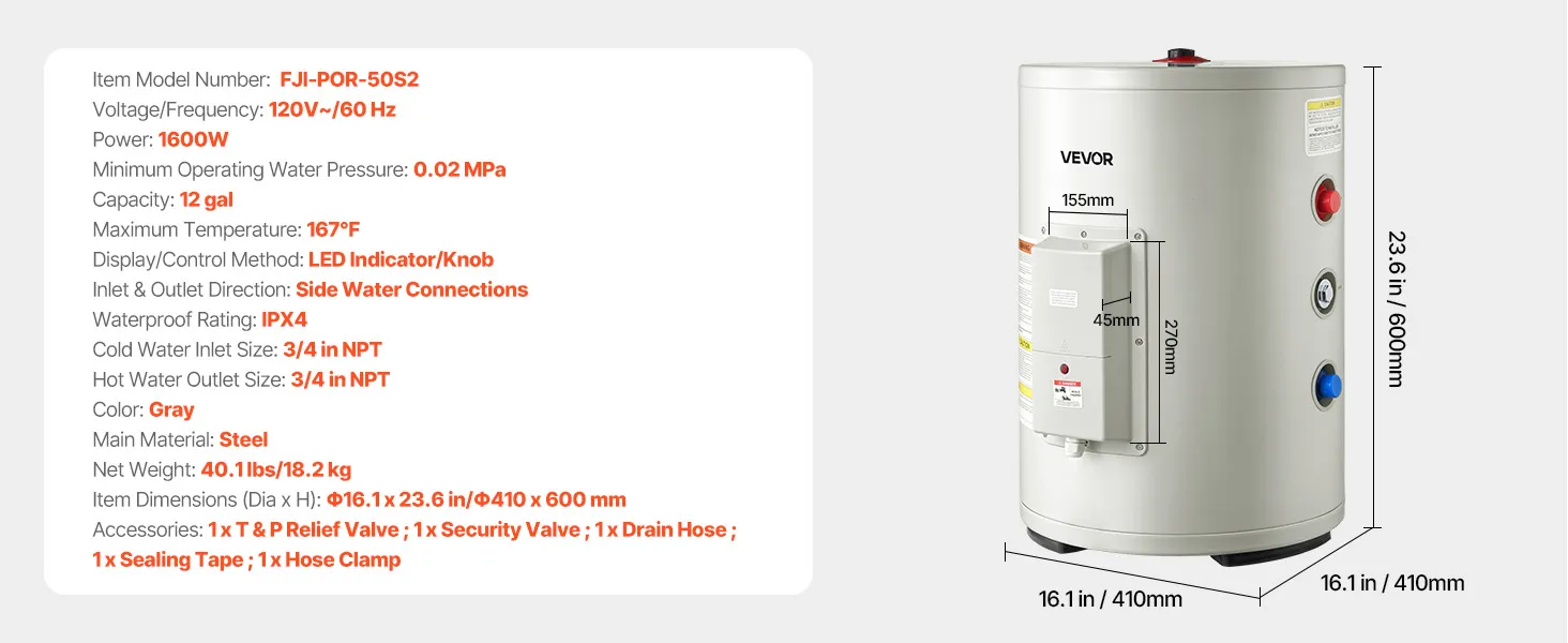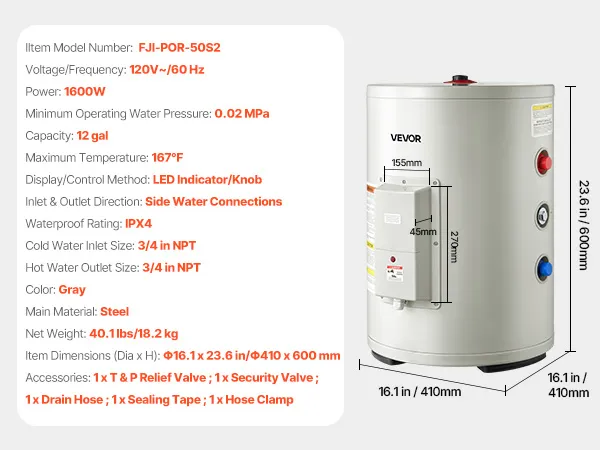 Calentador de agua eléctrico VEVOR de 12 galones, 1600 W, punto de uso, pantalla LED, control de perilla, salida lateral, diseño de almacenamiento de 120 V con válvula de temperatura y presión para apartamentos y estudios pequeños, gris
