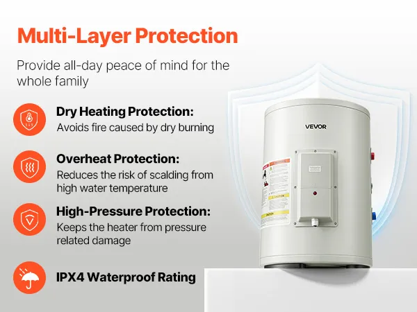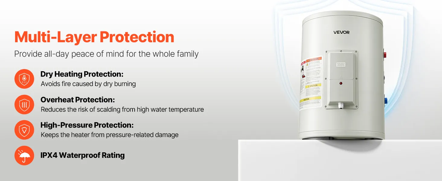 Fiable y duradero: El interior de esmalte resistente a altas temperaturas y a la corrosión garantiza un uso prolongado. Con protección integrada contra calentamiento en seco, sobrecalentamiento y sobrepresión, y clasificación de impermeabilidad IPX4, este calentador de agua está diseñado para mayor seguridad.