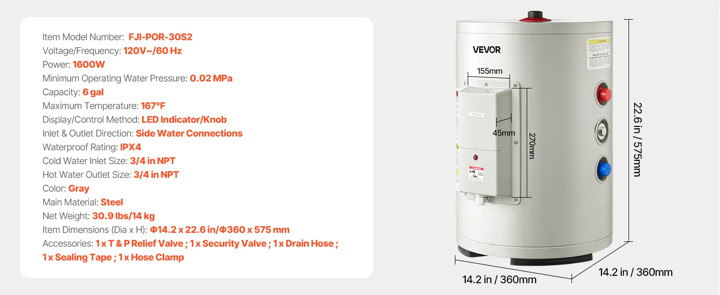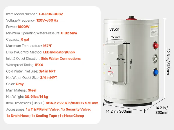 Calentador de agua eléctrico VEVOR de 6 galones, 1600 W, punto de uso, pantalla LED, control de perilla, salida superior, diseño de almacenamiento de 120 V con válvula de temperatura y presión para apartamentos tipo estudio y autocaravanas, color gris