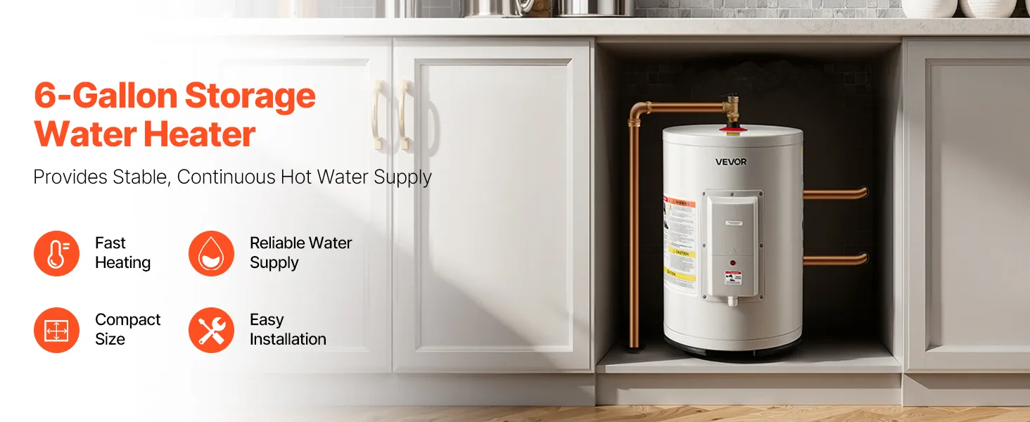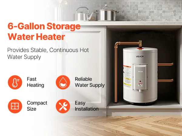 Capacidad de 6 galones: Nuestro calentador de agua con tanque es ideal para apartamentos individuales y casas rodantes, o como fuente adicional de agua caliente para baños de invitados y fregaderos de cocina. Ocupa poco espacio y satisface las necesidades diarias, como lavar las manos, lavar los platos y realizar tareas de limpieza ligera.