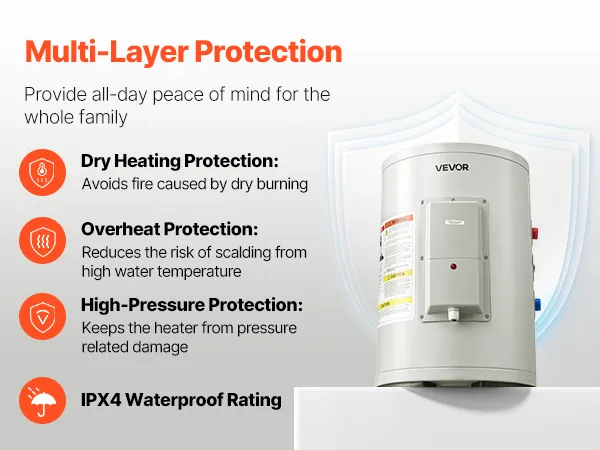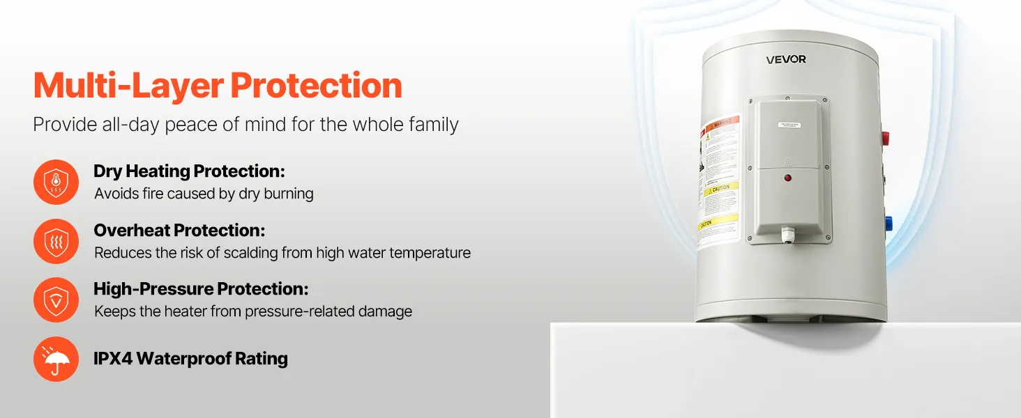 Fiable y duradero: El interior de esmalte resistente a altas temperaturas y a la corrosión garantiza un uso prolongado. Con protección integrada contra calentamiento en seco, sobrecalentamiento y sobrepresión, y clasificación de impermeabilidad IPX4, este calentador de agua está diseñado para mayor seguridad.