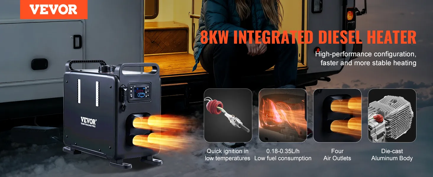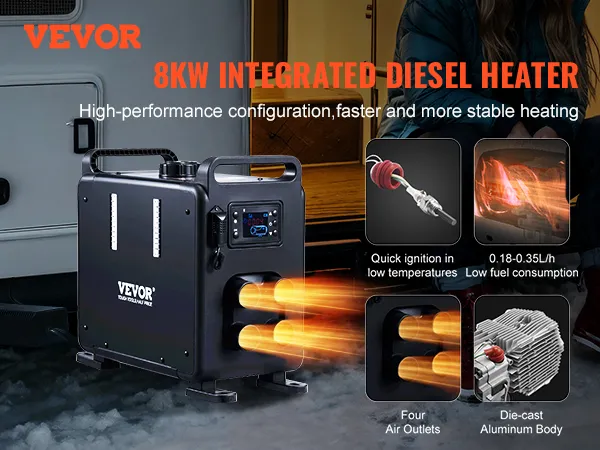 Calefactor diésel VEVOR de 8 kW, todo en uno, 12 V/24 V, control por aplicación Bluetooth, mando a distancia y pantalla, alarma de CO, calefacción vertical portátil de rápido calentamiento para vehículos y garajes.