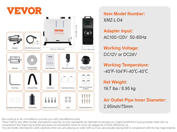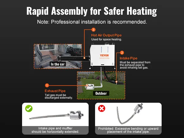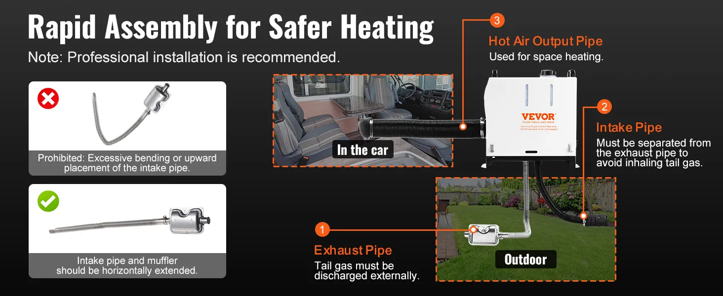 Protección múltiple: para brindarle un producto más seguro, el producto ha pasado una certificación de seguridad de alto nivel, con protección incorporada contra sobrecalentamiento (≥536 ℉/280 ℃), cortocircuito, sobrecorriente, sobretensión y conexión inversa, lo que garantiza tranquilidad durante el uso del vehículo, camping y actividades diarias. Recomendación: Se recomienda la instalación profesional y el escape debe ventilarse externamente.