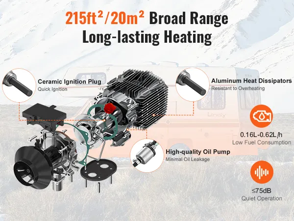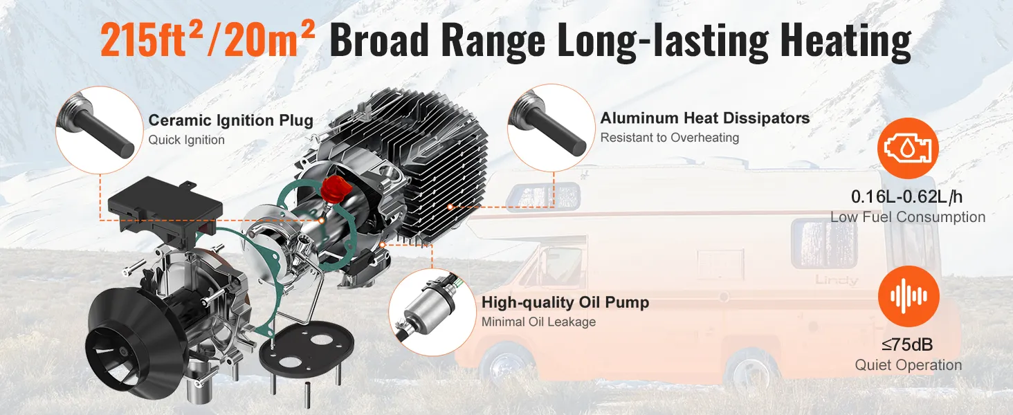 Bajo consumo de combustible: Nuestro calentador diésel tiene un rango de potencia de 5 a 8 kW con una eficiencia de calentamiento de ≥90 %. Consume solo 1 galón de diésel por noche para mantener caliente continuamente una gran área de 215 pies cuadrados/20㎡. Cuenta con control de termostato inteligente incorporado y silenciador de alta calidad para un nivel de ruido bajo ≤75 dB, lo que garantiza un sueño confortable en vehículos recreativos y campamentos al aire libre sin que el frío lo moleste.