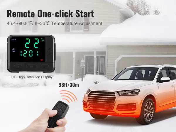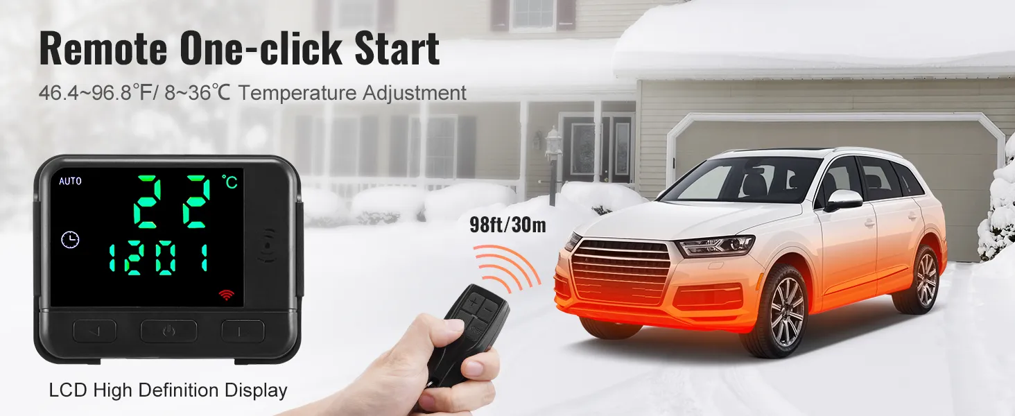 Dos métodos de control: Equipado con un control remoto de larga distancia de 98 pies/30 m, puede encender fácilmente el calentador diésel con un solo clic por adelantado. La temperatura se puede ajustar libremente entre 46,4~96,8℉/8~36℃, lo que elimina el frío dentro del vehículo, la escarcha fuera del vehículo y el empañamiento de las ventanas, lo que le permite sentir calor tan pronto como ingresa al vehículo. La pantalla de visualización de alta definición también permite un control sencillo, lo que le permite comprender el estado de la máquina sin esfuerzo.