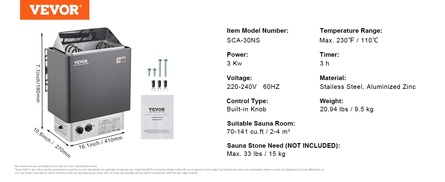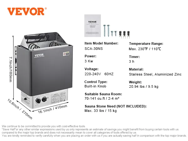 Calentador de sauna VEVOR, estufa eléctrica de 3 kW y 220 V, con controles integrados, temporizador de 3 h y temperatura ajustable para un máximo de 70-141 pies cúbicos, ideal para duchas de spa, hoteles y hogares.