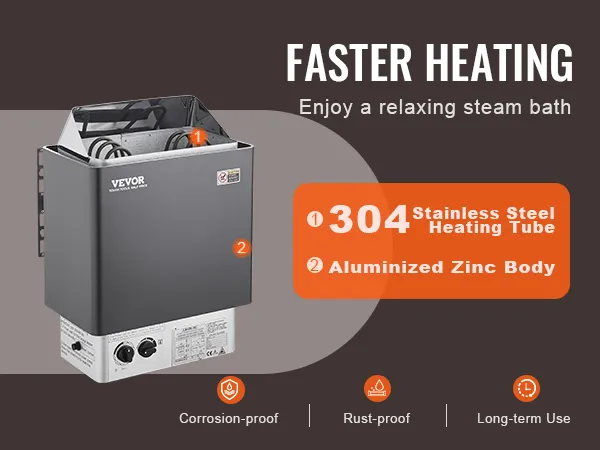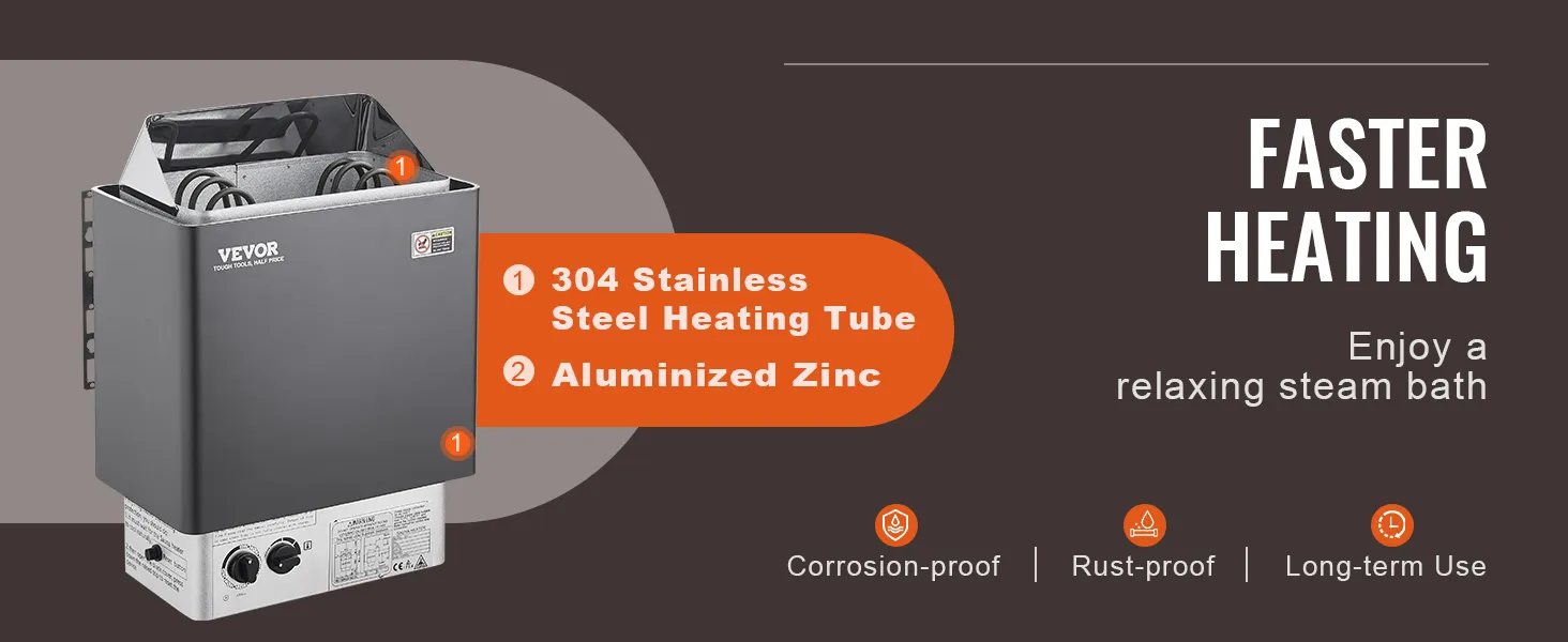 Construcción duradera: el calentador de sauna cuenta con una carcasa de zinc aluminizado, lo que garantiza una alta resistencia a la corrosión y una larga vida útil del calentador, incluso en entornos con mucha humedad. El elemento calefactor de acero inoxidable 304 garantiza una distribución rápida y uniforme del calor, lo que proporciona una experiencia de sauna cómoda en poco tiempo.