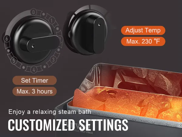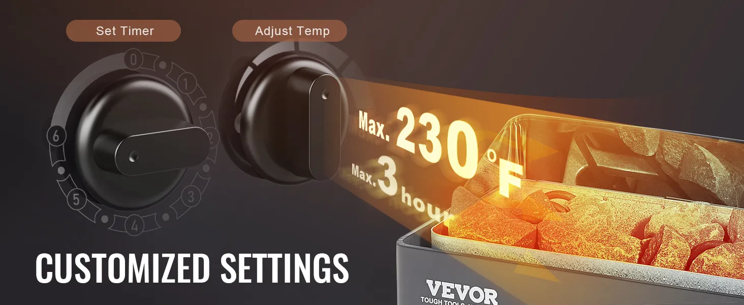 Ajuste la temperatura y el tiempo: el calentador de sauna para el hogar cuenta con perillas mecánicas fáciles de usar para controlar la temperatura y el tiempo, lo que le brinda la flexibilidad de personalizar su experiencia de sauna según su comodidad. Con una temperatura máxima de 230 ℉ y una capacidad de temporización de hasta 3 horas, tiene control total sobre su sesión de sauna.
