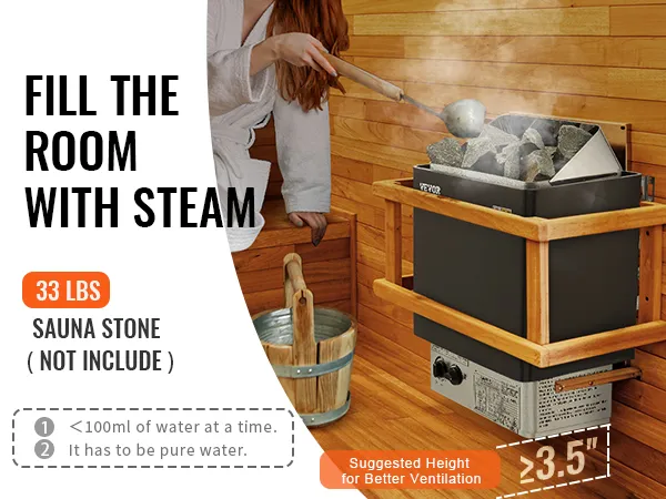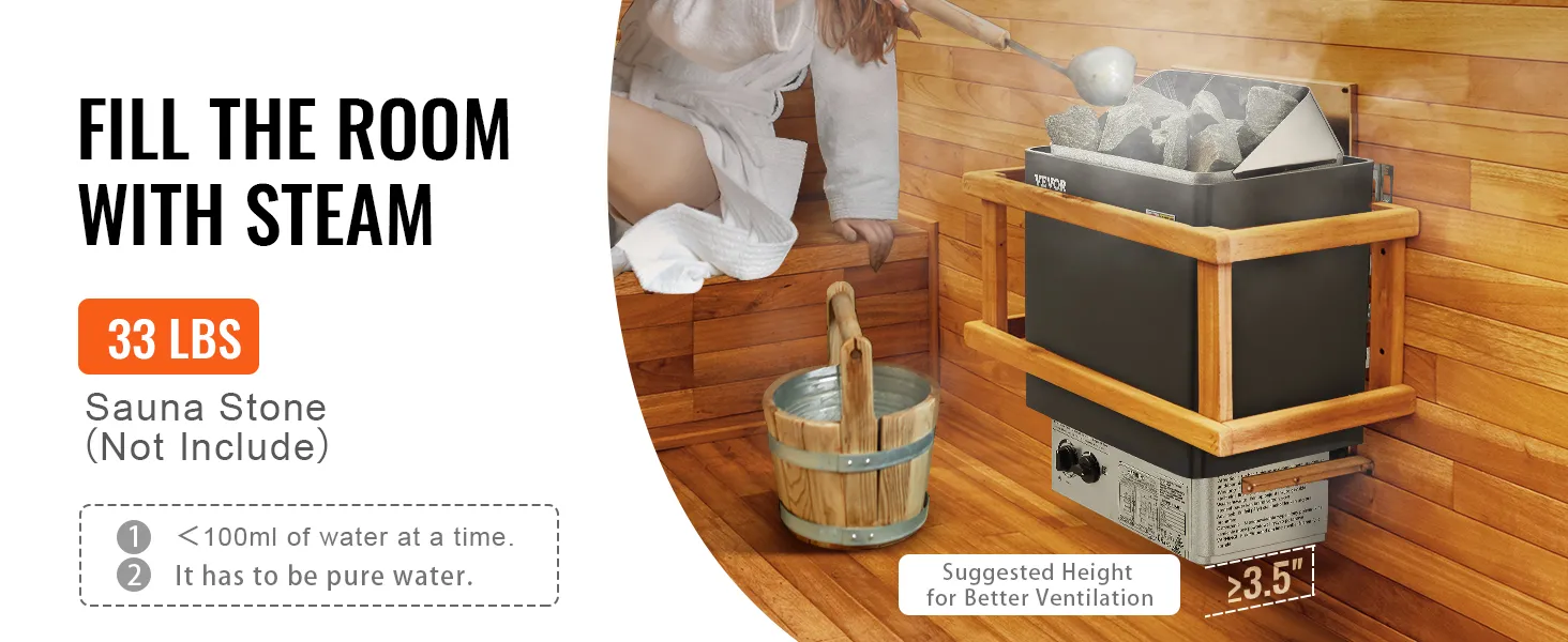 Calentamiento rápido: Potencia: 3KW; Sala de sauna adecuada: 70-141 pies cúbicos / 2-4 m³; Dimensiones: 16,1'' x 10,6'' x 22''. Necesidad de piedras para sauna: 33 lbs / 15 kg. Nota: Las piedras para sauna NO ESTÁN INCLUIDAS. La amplia capacidad de las piedras permite que estas absorban y almacenen el calor, lo que garantiza una retención y dispersión efectivas del calor.