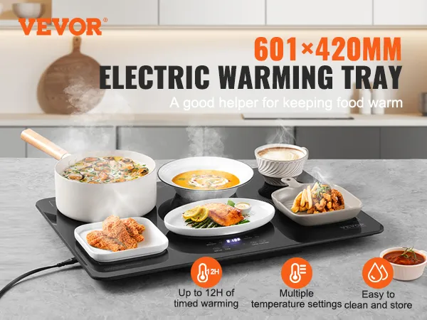 Bandeja calefactora eléctrica VEVOR, bandejas calefactoras para bufé, bandejas calefactoras con control de temperatura ajustable, calentador de alimentos portátil de vidrio templado, placa calefactora perfecta para fiestas, catering, vacaciones