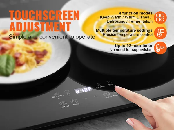 Nuestra bandeja calentadora eléctrica cuenta con 4 modos funcionales y múltiples configuraciones de temperatura ajustables, la pantalla táctil permite una operación simple y conveniente.
