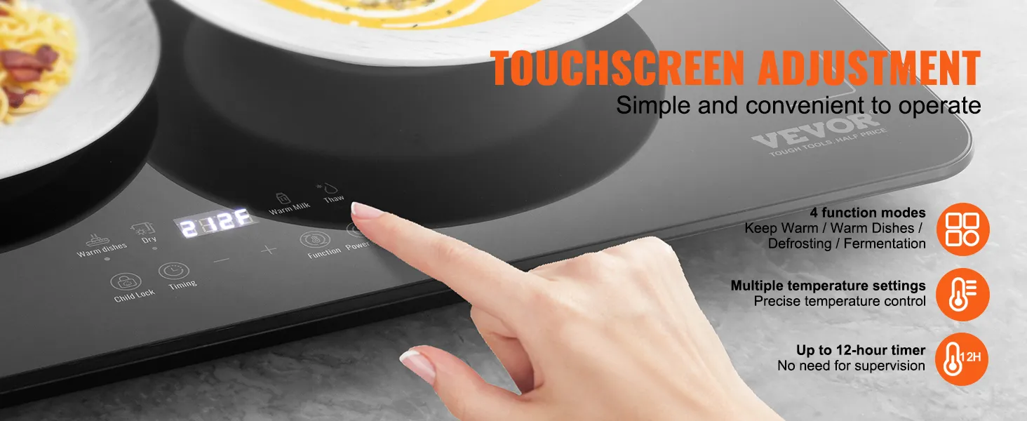 Fácil control de temperatura: esta bandeja para calentar alimentos cuenta con una interfaz de pantalla táctil con 4 modos funcionales y configuraciones de temperatura ajustables. Una vez configurada, muestra lecturas de temperatura en tiempo real para un control preciso. Ofrece múltiples funciones, como calentar, mantener calientes los alimentos, descongelar y fermentar, lo que la hace fácil y cómoda de usar.
