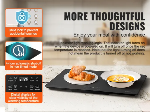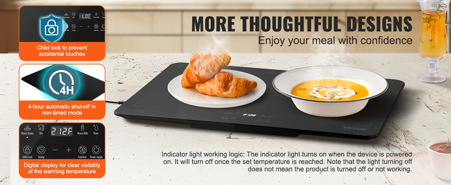 La superficie completa de la bandeja calentadora eléctrica se calienta de manera uniforme, brindando calor duradero a sus alimentos para que pueda disfrutar de comidas calientes en cualquier momento.