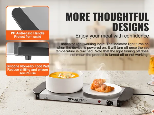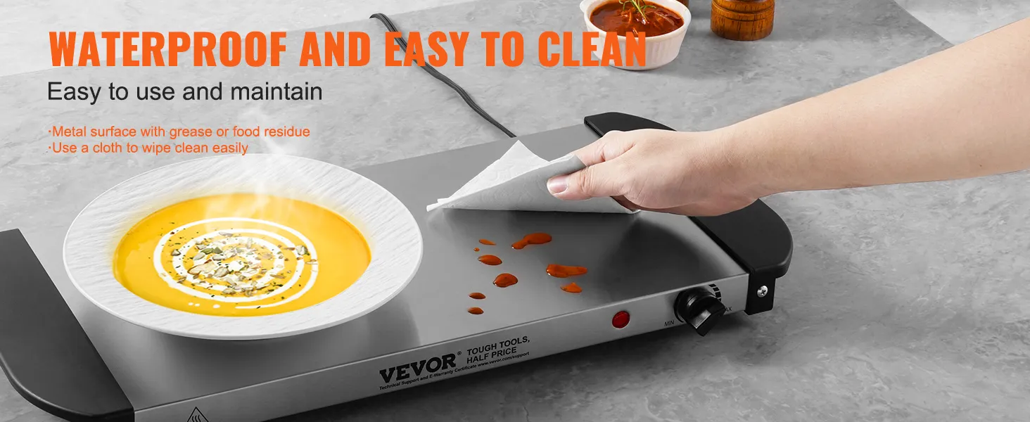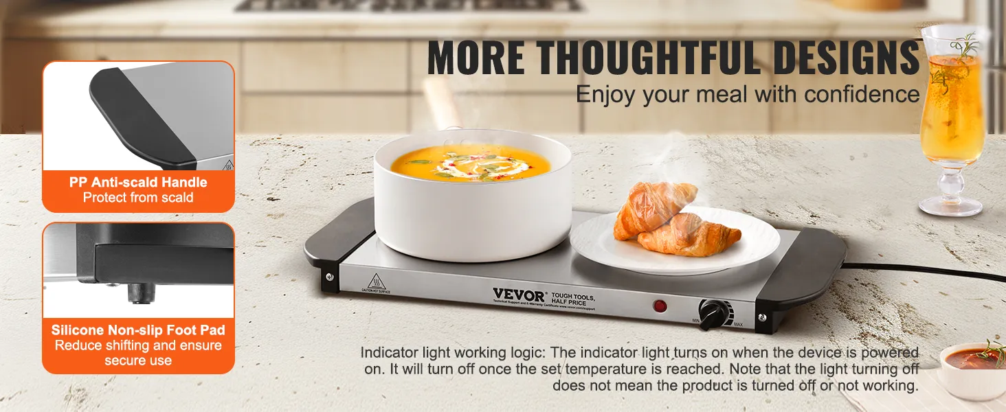 La superficie completa de la bandeja calentadora eléctrica se calienta de manera uniforme, brindando calor duradero a sus alimentos para que pueda disfrutar de comidas calientes en cualquier momento.