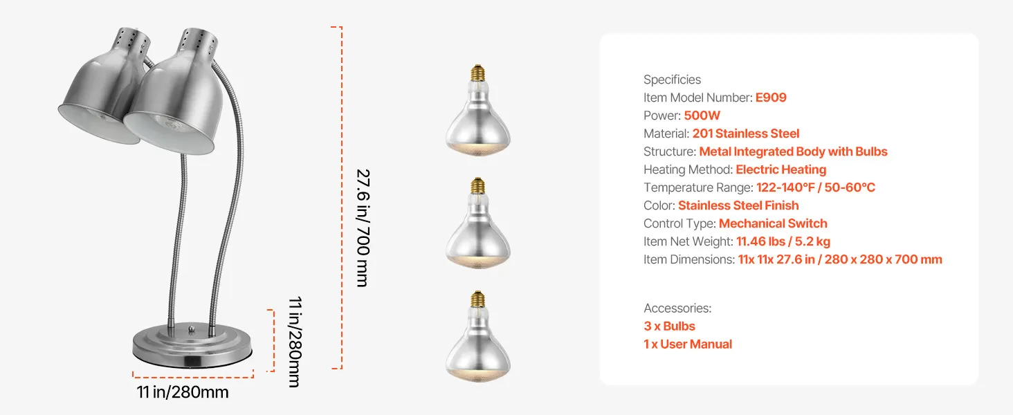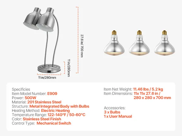Two 250W Infrared Bulbs: Our food warming lamp heater includes two 250W bulbs and a spare, so you don't have to buy extras. Moreover, these bulbs are designed for easy removal and replacement, delivering fast and efficient heat to keep food at the ideal temperature.