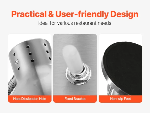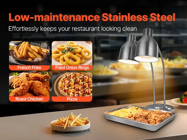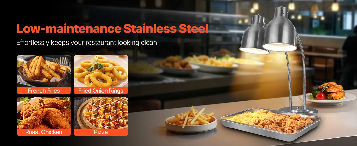 Commercial Food Heat Lamp: Made from high-quality stainless steel, our food heat lamp resists rust and warping, making it a terrific choice for commercial environments. Its non-corrosive, easy-to-clean surface helps your food stay hygienic while keeping your kitchen running smoothly.