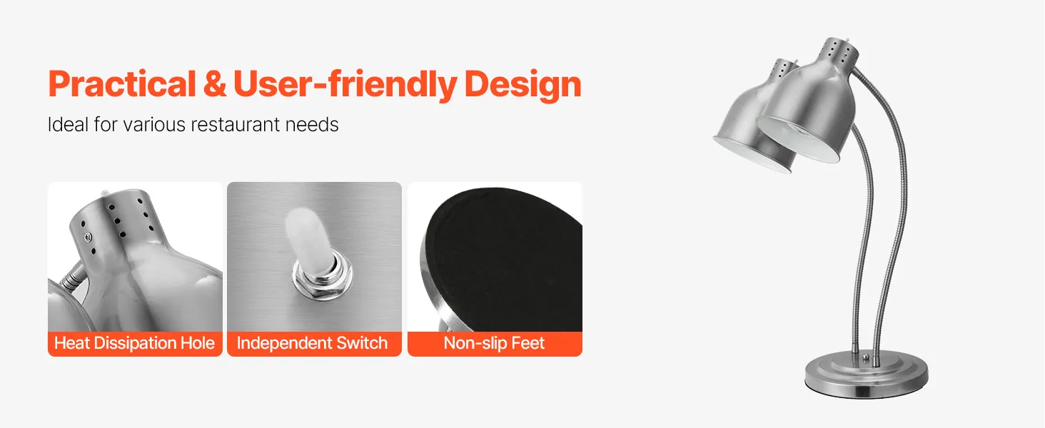 Our food heating lamp is packed with user convenience in mind. It comes with an independent switch to make operation a breeze and non-slip rubber feet on the base for added stability. It's versatile enough to hold food trays of any size securely.