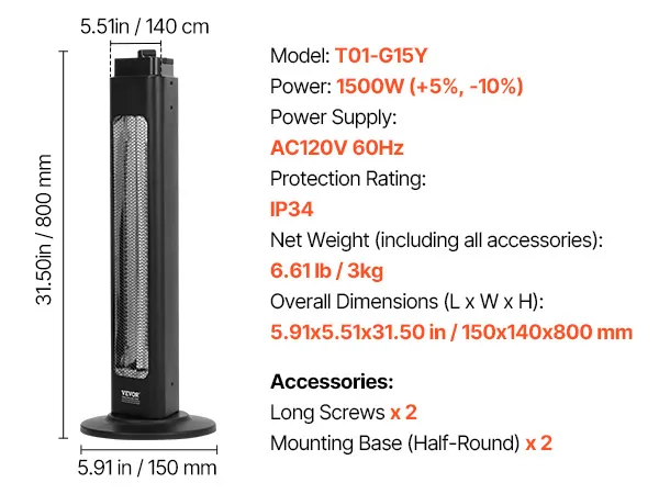 Múltiples configuraciones de temperatura: Con una potencia máxima de 1500 W, este calefactor infrarrojo eléctrico admite 3 configuraciones de temperatura (430 W-1500 W), lo que lo hace versátil para diversas condiciones de frío. Ideal para patios, garajes, estudios y más.