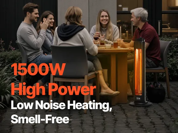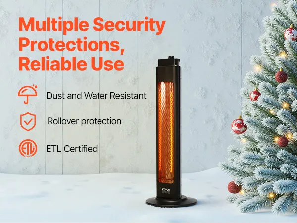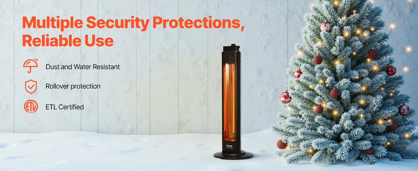 Resistente al agua y al polvo: Con una carcasa de aleación de aluminio, este calefactor infrarrojo es resistente a la corrosión y está diseñado para una larga duración. Con certificación IP34 y pruebas ETL y FCC, funciona sin problemas en cualquier condición climática, sin verse afectado por la lluvia ni la nieve.