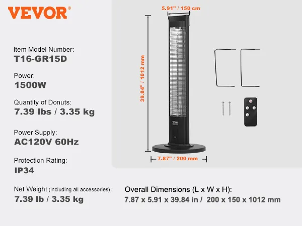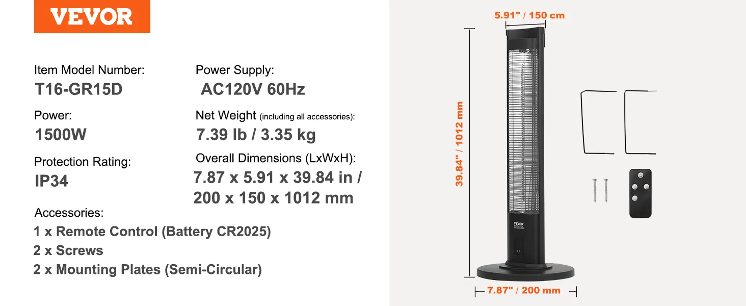 VEVOR Infrared Heater, 1500W Remote Control Electric Space Heater, Patio Heater w/ 3 Speeds & Timer & Tip-Over Protection, Outdoor/Outdoor for Bedroom,Studio,Porch,Dining Room,Studio, Stand,40in L