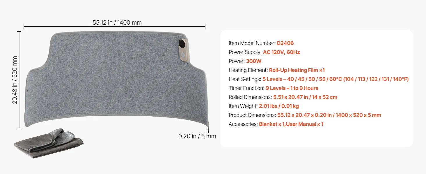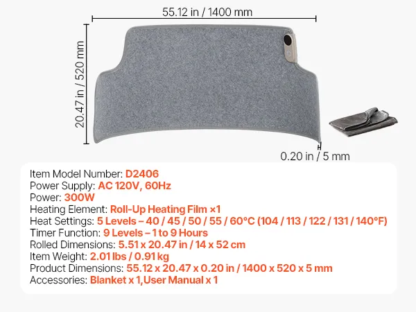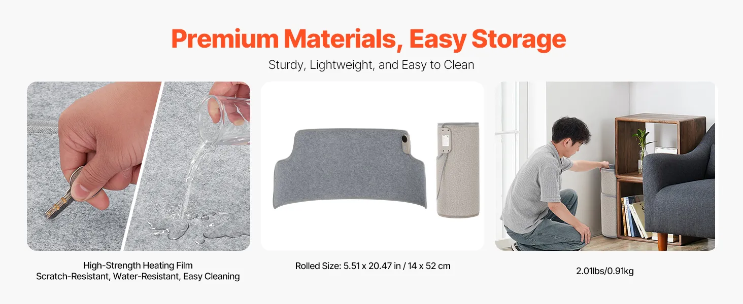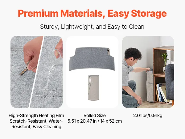 Fabricado con material de película calefactora eléctrica de alta resistencia, es resistente a rayones, fácil de limpiar y sencillo de almacenar, lo que lo hace liviano y portátil.