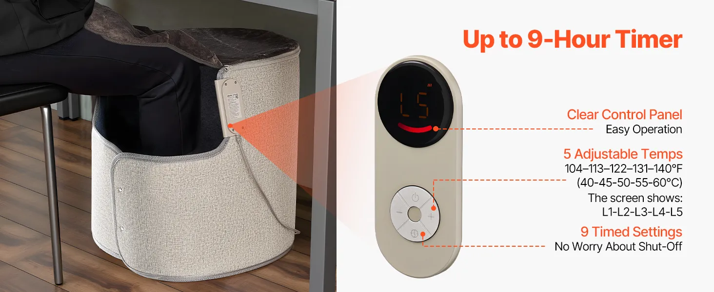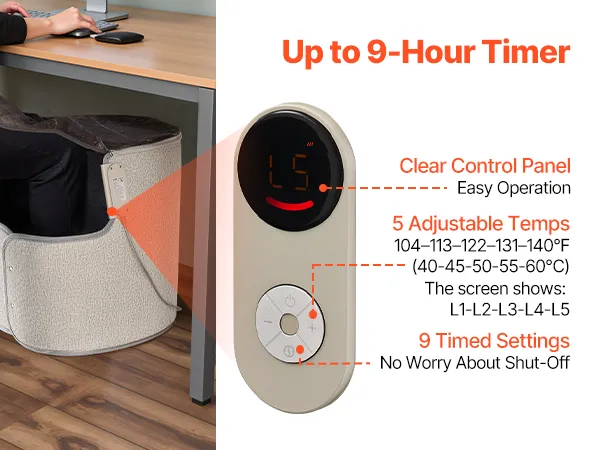 Control dual para un manejo sencillo: Compatible con los modos táctil y remoto. El panel de control intuitivo ofrece cinco ajustes de temperatura (40-60 °C) y un temporizador de 9 horas. El control remoto permite ajustar la temperatura a distancia, lo que proporciona comodidad y facilidad.
