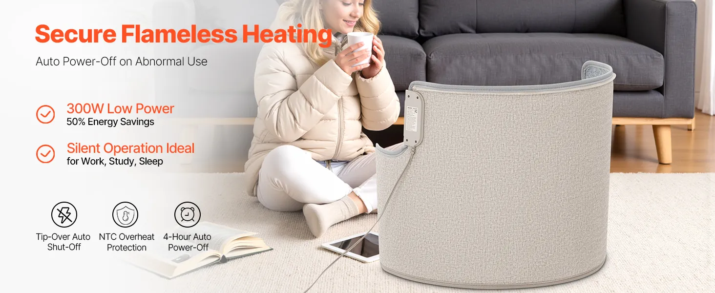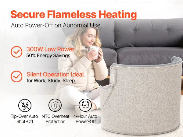 Seguro y de bajo consumo: Con solo 300 W, este calefactor portátil ahorra energía y es seguro. Utiliza tecnología de calefacción radiante sin llama e incluye apagado automático, protección contra sobrecalentamiento NTC y un temporizador de 4 horas para su tranquilidad.